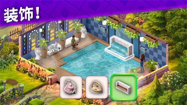 8、充满轻松愉悦感的三峰纸牌谜题,尽情展现你那令人赞叹不已的装修技艺。来改造庄园的花园、大厅、卧室、书房等诸多场景吧!这里有成千上万种设计选项与风格,助你自由搭配出心中的梦想庄园!
