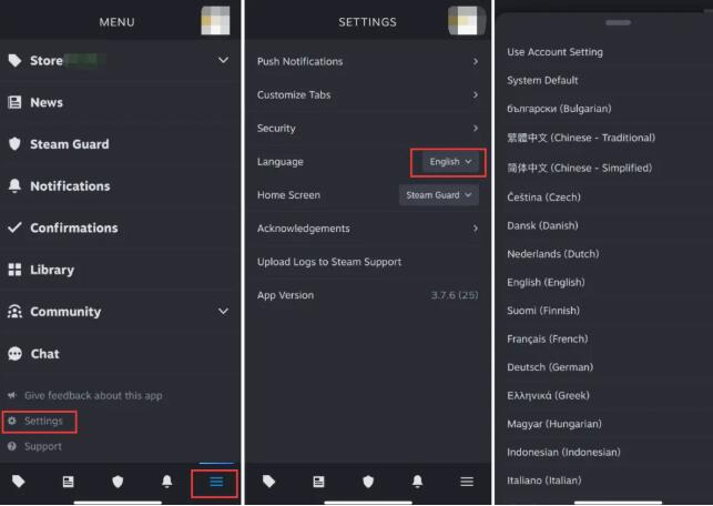 在右下角的菜单里,按顺序选择:Settings->Language,接着挑选需要的语言。