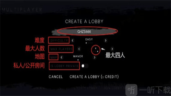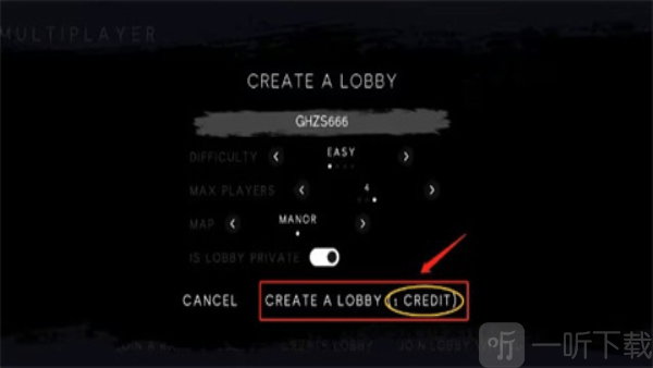 5. 完成填写后,点击【CREATE A LOBBY(1 CREDIT)】创建一个房间。