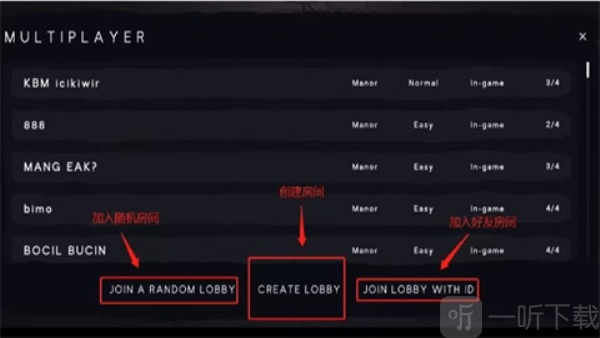 2. 在多人游戏界面的底部,能看到三个选项,依次为【加入随机房间】、【创建房间】以及【输入ID加入房间】