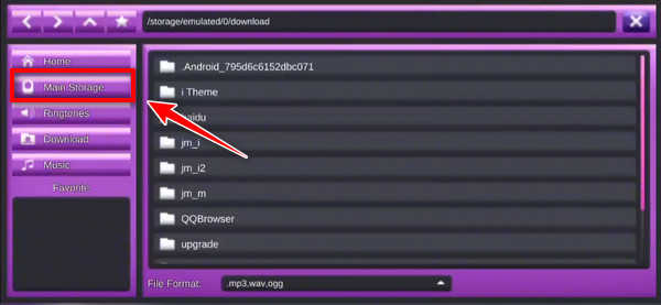 7、点击此处切换至手机根目录,接着寻找你之前存放在手机里的音乐所在位置。