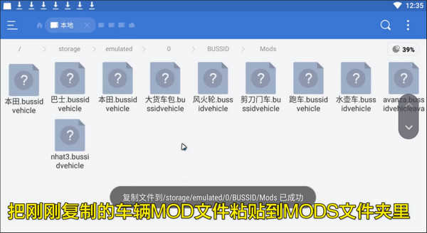 2、操作完成后,打开手机的文件管理应用,在“Android”文件夹里查找“dats”。若文件来自QQ群,就依次点击“tencen”、“QQfile”,长按里面的“mod”文件,然后将其移动至“BUSSID”文件夹中。