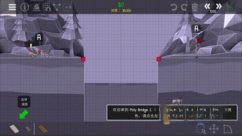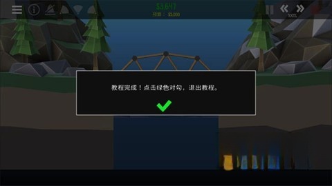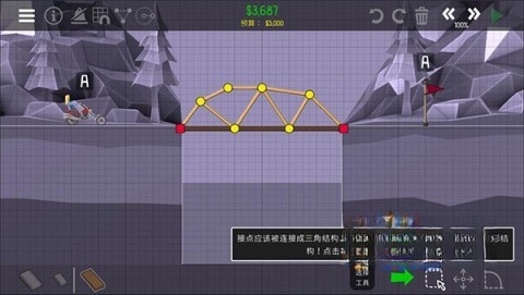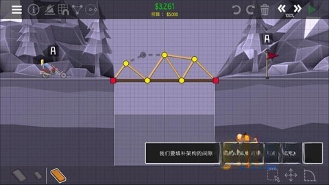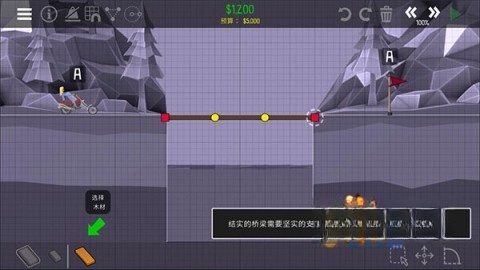 下面进入第二关(1.2),玩家要借助给定的四个锚点搭建一座稳固且能承载卡车重量的桥,注意三角形结构是关键所在。