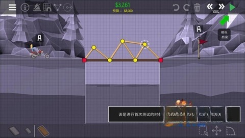 第一关(1.1)很适合新手,有着简洁易懂的教程,会教你怎样铺设路基,只要依照虚线摆放木板,接着验证汽车能否安全过桥就行。