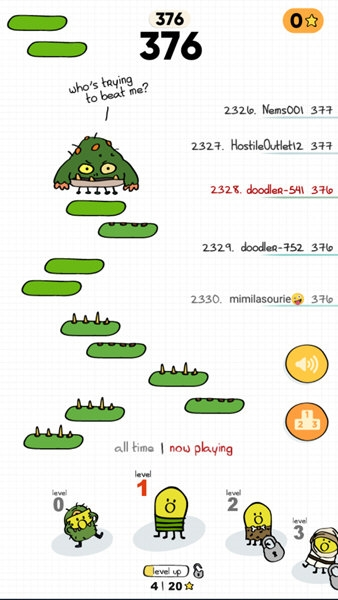 《涂鸦跳跃2》作为经典休闲跳跃类游戏,是《涂鸦跳跃》的续作。游戏整体呈现出可爱的卡通风格,还设有多样新颖的地图供玩家体验。玩家通过倾斜屏幕,可实现角色左右移动,当角色触碰到台阶便会自动向上跳跃。在跳跃过程中,会出现诸如尖刺、怪物、黑洞等各类障碍物,一旦触碰,游戏即结束。不过,游戏里也存在一些功能性道具,像火箭、蹦床、弹簧等,借助这些道具,玩家能加速跳跃,从而达到更高高度,获取更高分数。